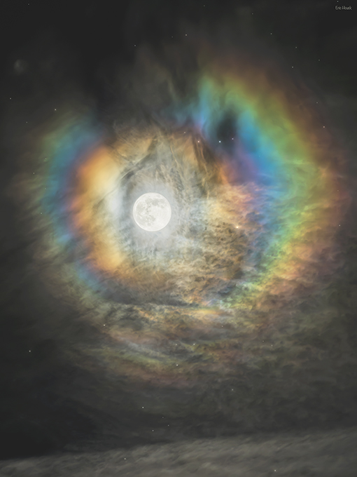 由於不同顏色的光具有不同的波長,因此,每種顏色光繞射的方式也不同。月華是少數幾種用肉眼即可輕鬆觀測到的彩色繞射現象之一。這張主題影像展示了一個月華,拍攝於日前的滿月超級月亮附近,地點是在美國加州的奈特斯費里。在滿月右側是巨大的橙色恆星博泰因星。由於太陽亮度極高,圍繞太陽形成的類似日冕通常更難觀測到。◇