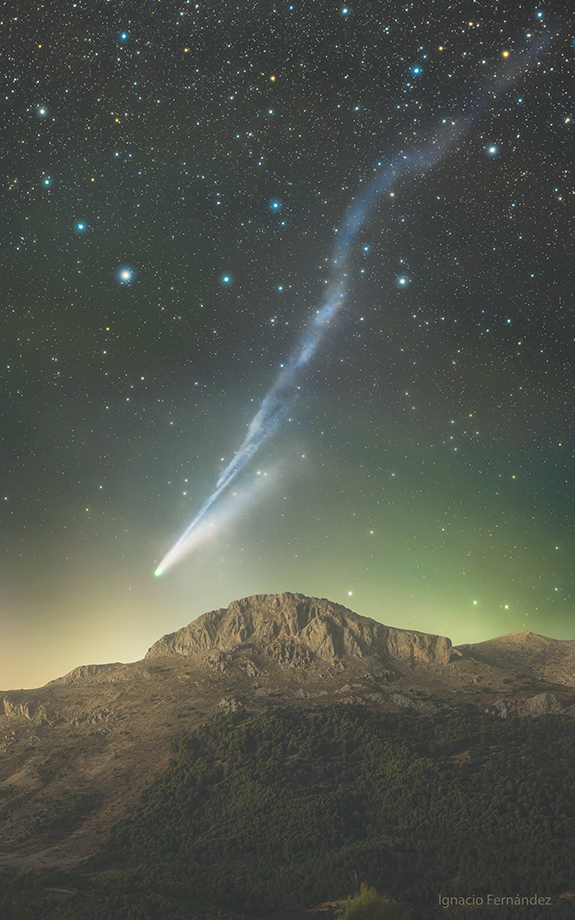 彗星「檸檬」的尾巴發生了甚麼變化?答案在風中飄揚-這裡的風指的是來自太陽的風。太陽持續向外噴射帶電粒子,這種持續的噴射流近來變化很大,因為太陽會爆發釋放能量,日冕物質拋射,這些爆發能量會推動並偏轉彗星自身釋放的帶電粒子。結果是彗星「檸檬」形成了一條藍色的離子尾,不僅結構精細複雜,還出現了一些不尋常的轉折。這張月前在西班牙阿爾法卡爾所拍攝的長時間曝光合成影像捕捉到了內太陽系的這種離子擾動。彗星「檸檬」正在逐漸消逝,因為它正遠離地球和太陽,回到外太陽系。◇