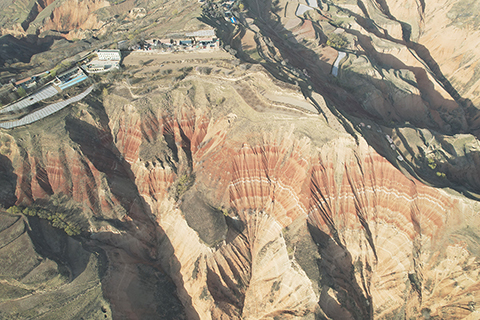 ◎ 這是四月三日拍攝的甘肅東鄉「羊肉卷」地貌(無人機照片)。在甘肅省臨夏回族自治州東鄉族自治縣東塬鄉境內,有山嶺岩層紅褐與灰白相間,從高空俯瞰,形似一片片鋪開的「羊肉卷」。(新華社記者張智敏 攝)